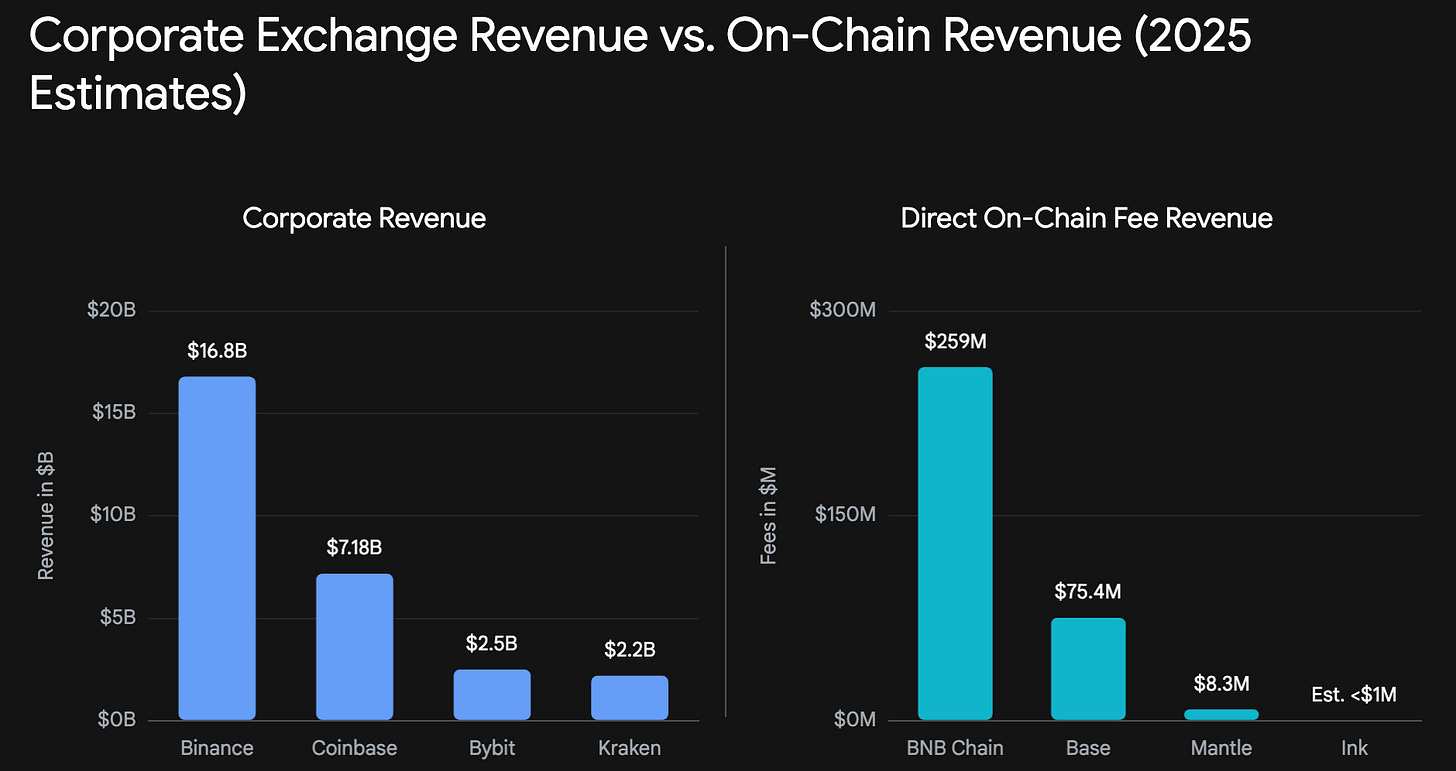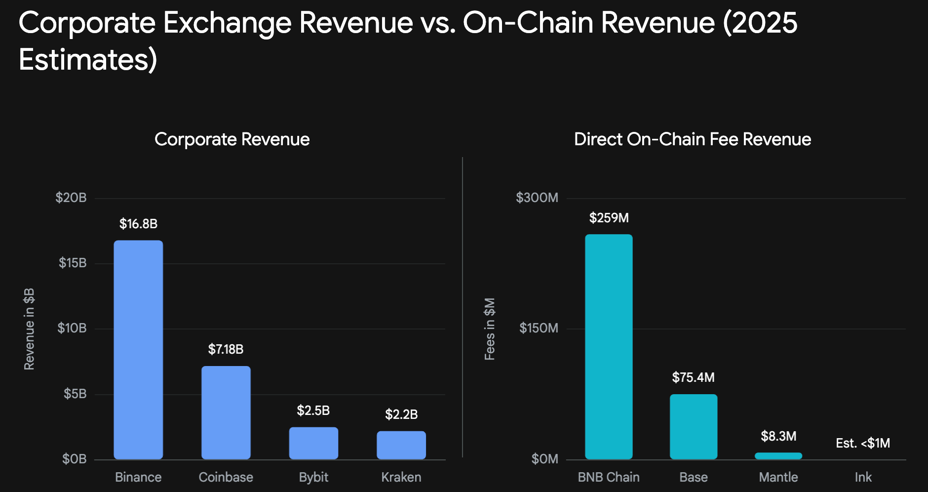 다만 초기 Binance Chain은 스마트 컨트랙트를 지원하지 않아 DeFi 생태계 구축에는 한계가 있었고, 이를 보완하기 위해 2020년 9월 EVM 호환 Binance Smart Chain(BSC)을 별도로 런칭하며 본격적인 온체인 생태계를 구축하기 시작했다. 이후 수많은 CEX들이 이 행렬에 동참하며 현재에 이른다. 현재 시장에서 두드러지는 플레이어들은 Coinbase의 Base, Binance의 BNB 체인이 이 카테고리를 이끌고 있으며, Bybit의 Mantle과 Kraken의 Ink 체인이 그 뒤를 따르고 있다.
